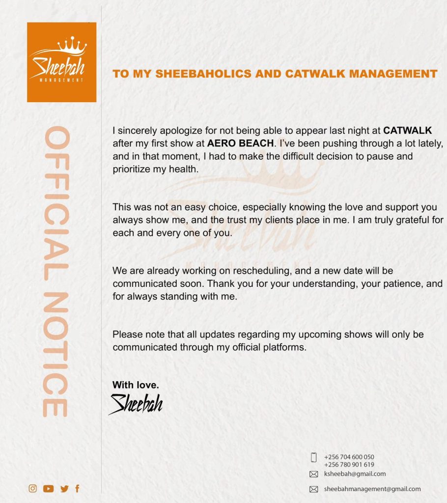 Sheebah also clarified that all updates about her shows will only come through her official platforms.