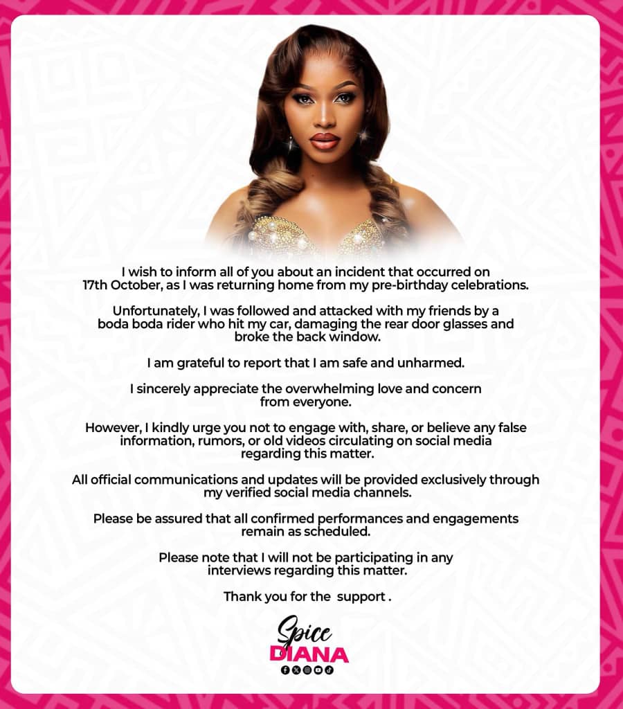 Ugandan music star Spice Diana has addressed the incident that occurred on 17th October following her pre-birthday celebrations.
